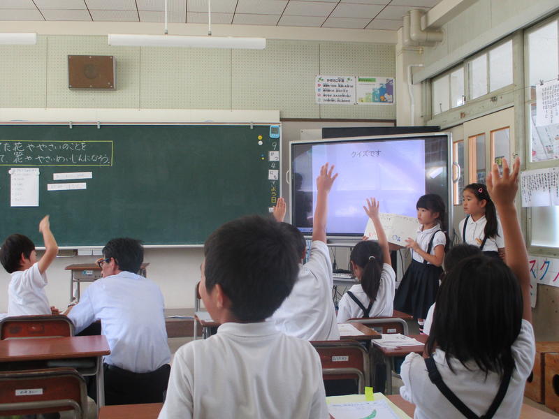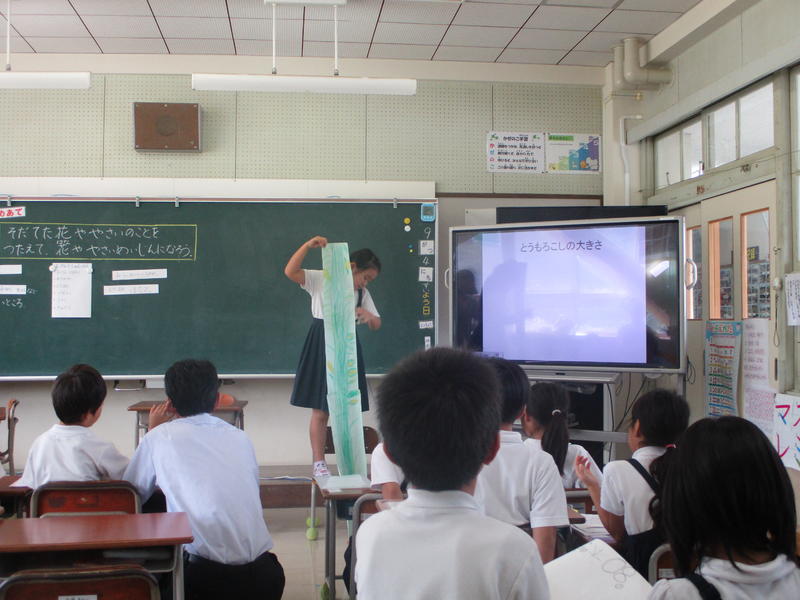 9月4日(水)3校時に、ゲストティーチャーをお招きして、研究授業を行いました。1,2年の生活科「やさいめいじんになろう」です。学校応援団の方々のご協力で学校園で野菜を育てました。今日は、野菜の生長について、子どもたちが電子黒板を使って発表。クイズを出したり、とうもろこしの茎や葉を絵で表し、その大きさを示したり、「伝えるための工夫」をして発表していました。とても上手に発表できました。最後には、ゲストティーチャーにも感想をいただきました。