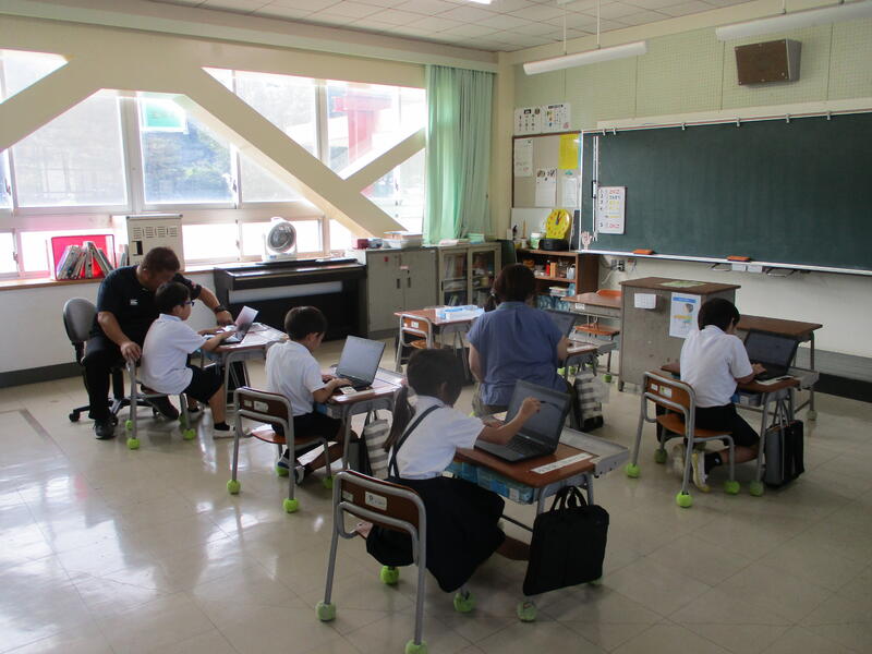 本日(9/6)の1時間目、1年生はタブレットを使った学習を、2年生は“つなぐ言葉”を使った会話の学習を、3年生は“I like 〇〇”を使った外国語学習を、4年生は水生生物探しを、5・6年は学習リーダーを中心にした国語の学習をしていました。みんな、意欲的に学んでいました。