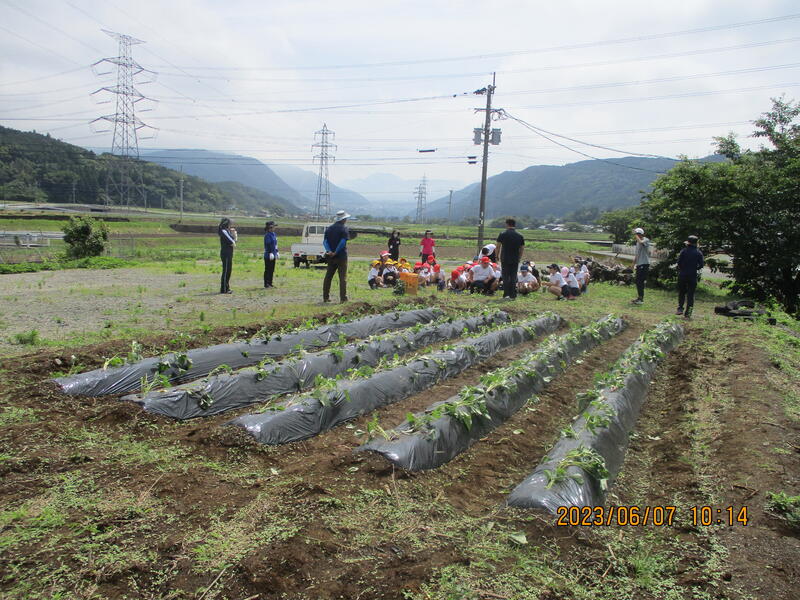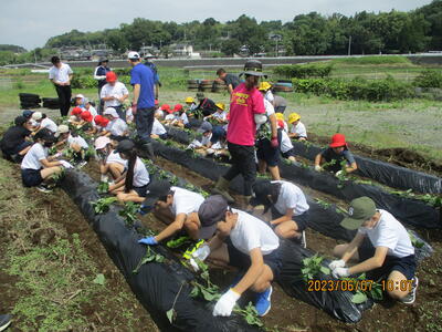 その後、芋畑に移動して、植え付けです。まつぼり風の影響を受けにくくするために、苗は阿蘇の方に向けて植えます。そのような知識を習得しながら、体験しました。