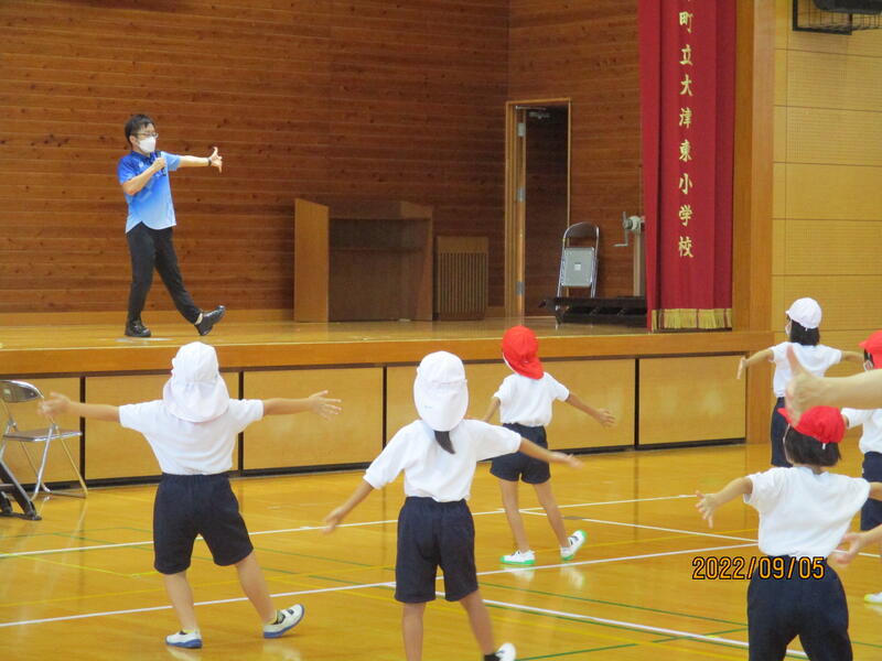 本日(9/5)2校時、全校児童は、大村詠一先生(大津町教育委員)に“からいもくん体操”をご指導いただきました。