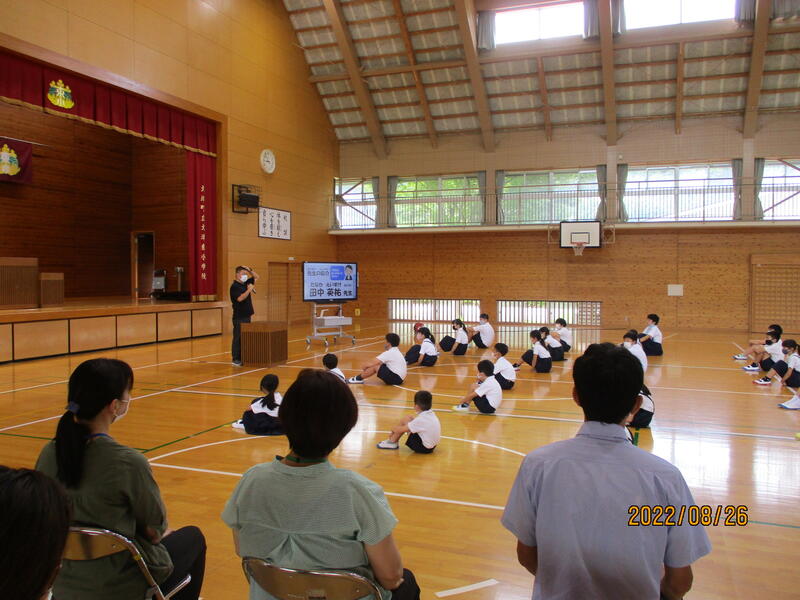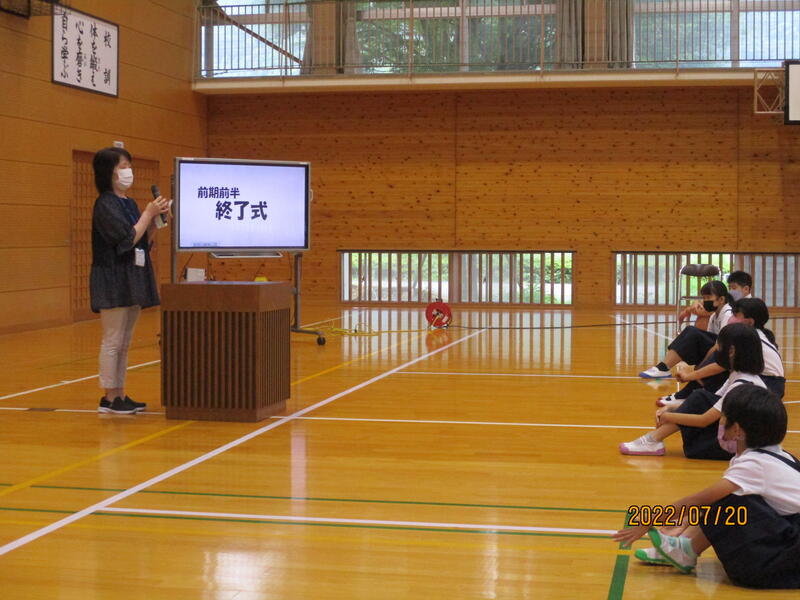 式では、児童代表(1年、3年、5年)が、前期の感想を堂々と発表してくれました。どれも自らを振り返り、分かりやすくまとめた内容でした。従って、みんな、応援するような眼差しで、真剣に聞いていました。
