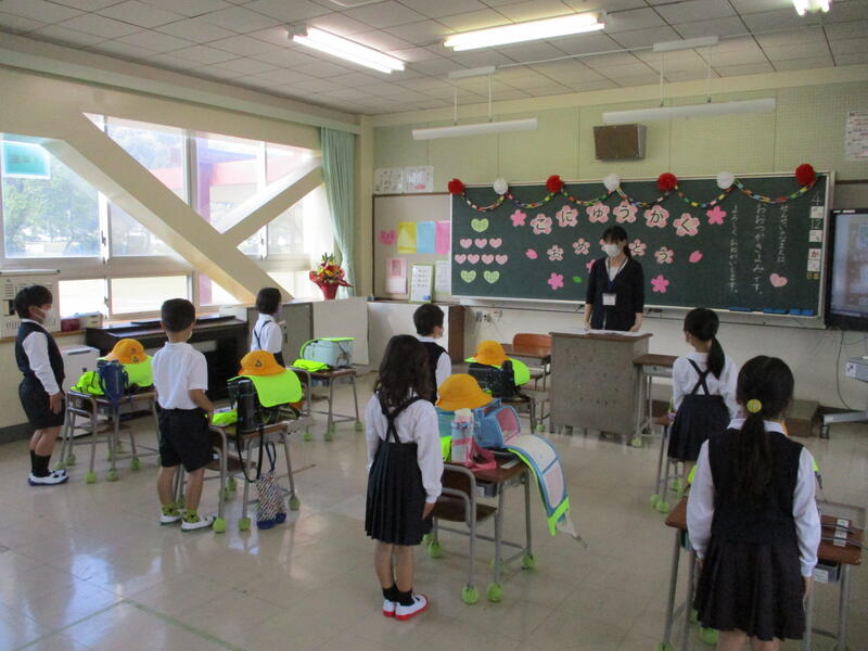 ※写真は、1年生の初めての健康観察の様子です。みんな、「おはようございます。」と元気に挨拶をすることができました。