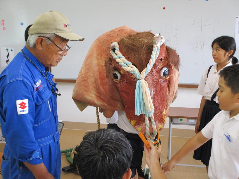 7月2日(火)5校時に、地域の牛舞い保存会の皆様7名に来てきただき、「牛舞い」という無形文化財の大切さと、それを受け継ぐことのすばらしさを話していただきました。全校児童に話していただきた後、4~6年生は早速練習に入りました。子どもたちも生き生きと練習に励んでいました。