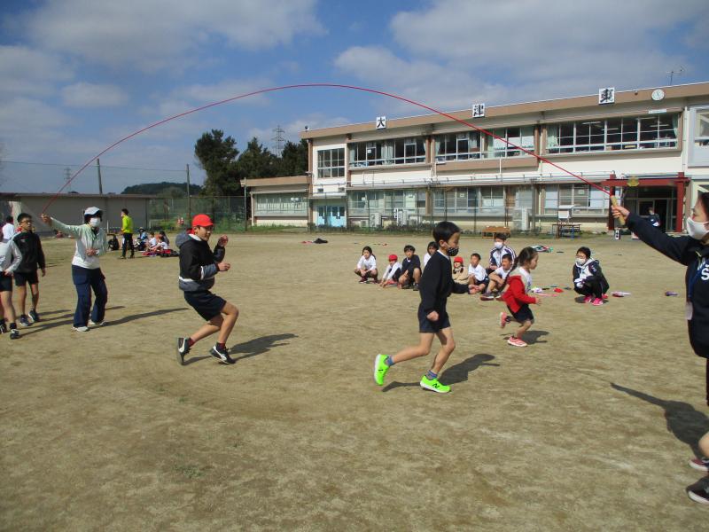 2月19日(金)3校時、晴天のもと運動場で全校で縄跳び大会を開催しました。学年別対抗短縄跳びでは、前跳び、後ろ跳び、二重跳びの3種目で1分間の累計回数を競いました。縦割り班対抗長縄跳びでは、3分間で跳んだ累計回数を競いました。