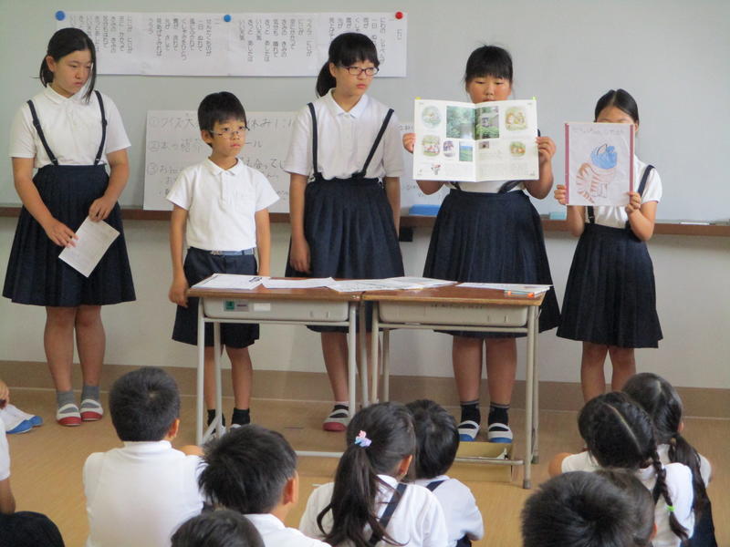 7月9日(火)朝の時間に、児童集会が行われました。図書委員会の発表でした。今後の図書員会の予定や夏休みの図書貸し出しについてお知らせした後に、読み聞かせも行いました。とても良い集会でした。