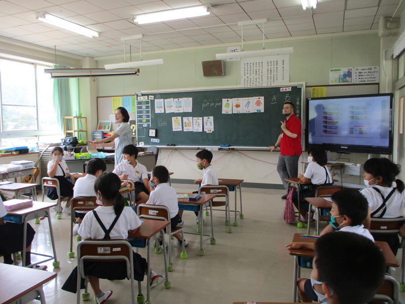 子どもたちは、電子黒板に見入り、しっかり聞いていました。
