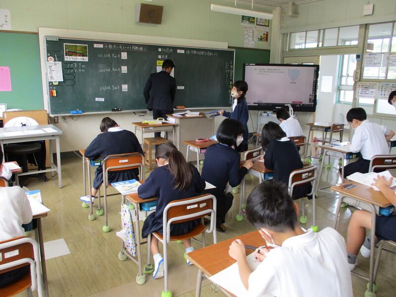 本校では、電子黒板を子どもが操作して、解答等も行います。正しく、校訓“自ら学ぶ”です。