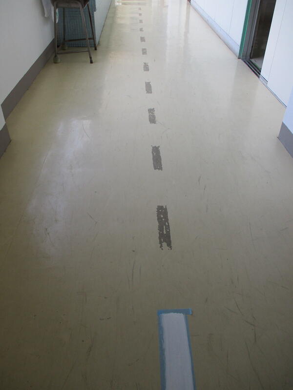 校務員さんに、1階廊下の中央線を引いていただきました。