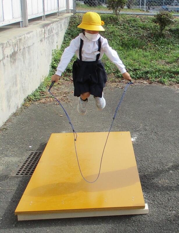 本日(11/2)昼休みに、縄跳びジャンプ台をお披露目しました。これは、ベニヤ板と角材でできています。少しの力で高くジャンプすることができます。