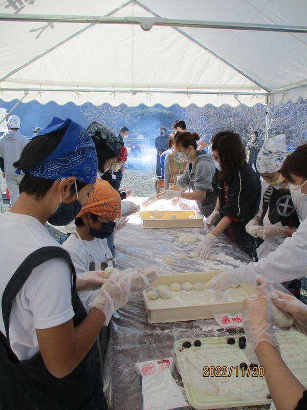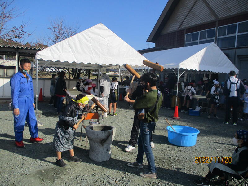 1・2年生はイモの袋分け、3・4年生はもろぶたなどの洗浄、5・6年生はテント建てや餅米洗いなど、みんなで協力して実施しました。