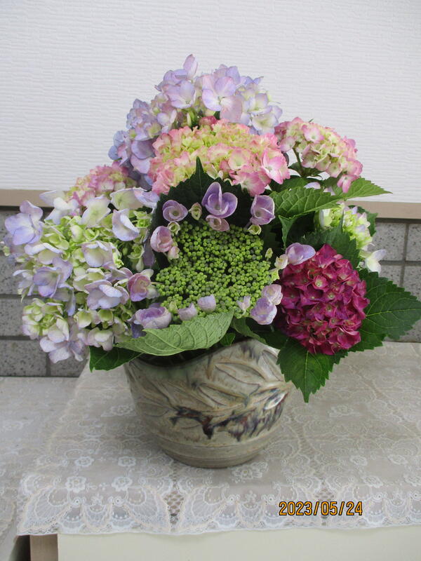 校務の先生に、ご自宅で咲いた“あじさい”を持ってきていただきました。それを、事務の先生と校務の先生に生けていただきました。