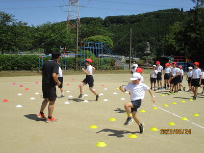 ご指導いただいたのは、NPO法人クラブおおづの後藤さんです。後藤さんは、日本体育大学で陸上競技などを極められた後、小・中学校及び高校で教鞭を執られた経験をお持ちです。本校では、学童スポーツクラブでご指導いただいています。スポーツの特性を大切にしながら、褒めながら自ら気付かせるような指導をなさり、子どもたちはめきめきと知識や技能を高め、自信を付けています。我々教職員もとても参考(勉強)になるご指導をなさるため、今回はGTとして依頼したところです。