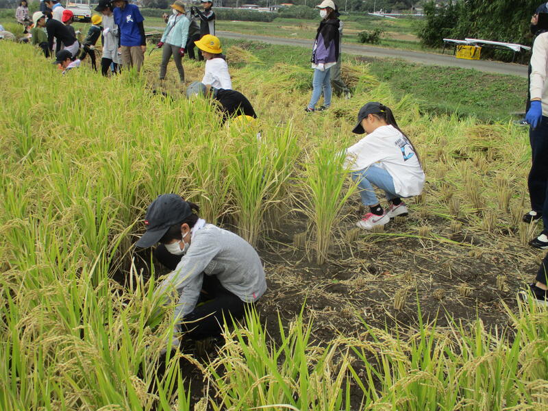昨日(10/13)、稲刈りをしました。稲刈りの指導に地域の方が9名、刈り取り応援にPTAの方が7名お越しいただきました。