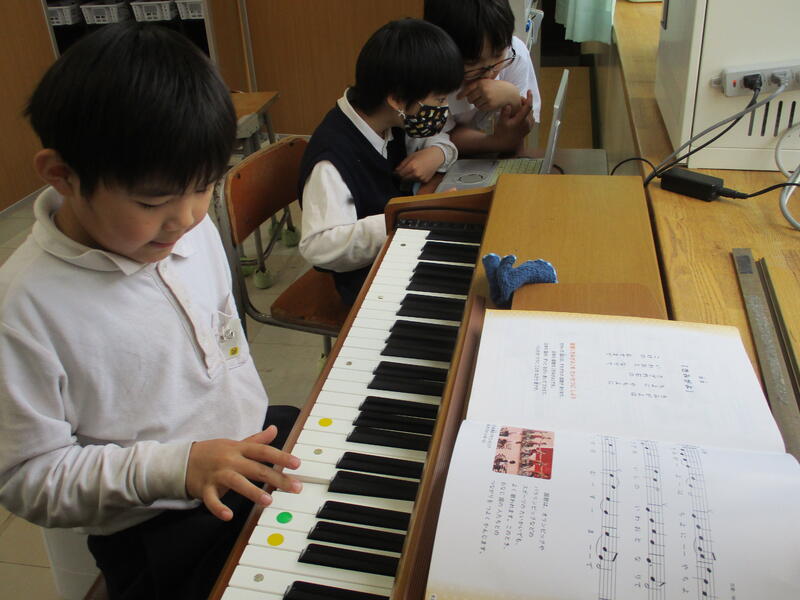 すると、音楽で学習した国歌「君が代」の伴奏練習をしている子や、PCを楽しむ子、そしてPCのアドバイスをしている子もいました。