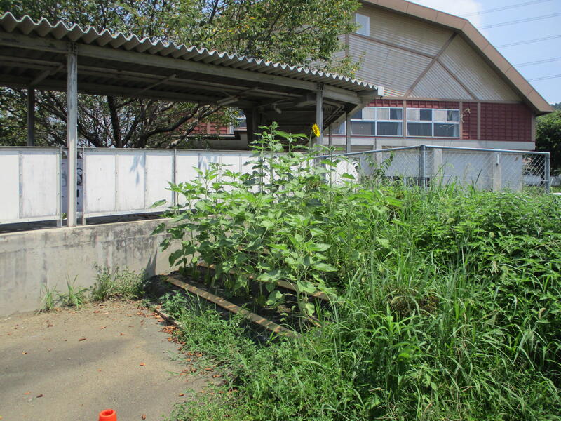 子どもたちが植えた児童玄関前のひまわり。本日(8/16)、1輪だけ大きな花が咲いていました。明後日(8/18)の愛校作業の際にはまたいくつか花を付けているかもしれません。