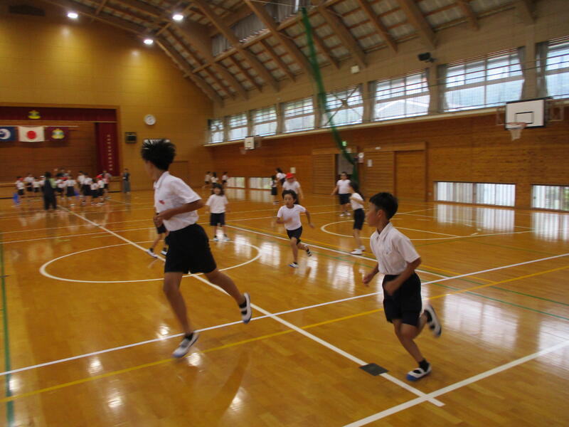 体育主任が子どもたちの心構えを確認し、徒走、台風の目、応援団の順に練習しました。実際に、運動会当日が雨天の場合、体育館で実施することになるため、子どもたちも気合いが入っていました。