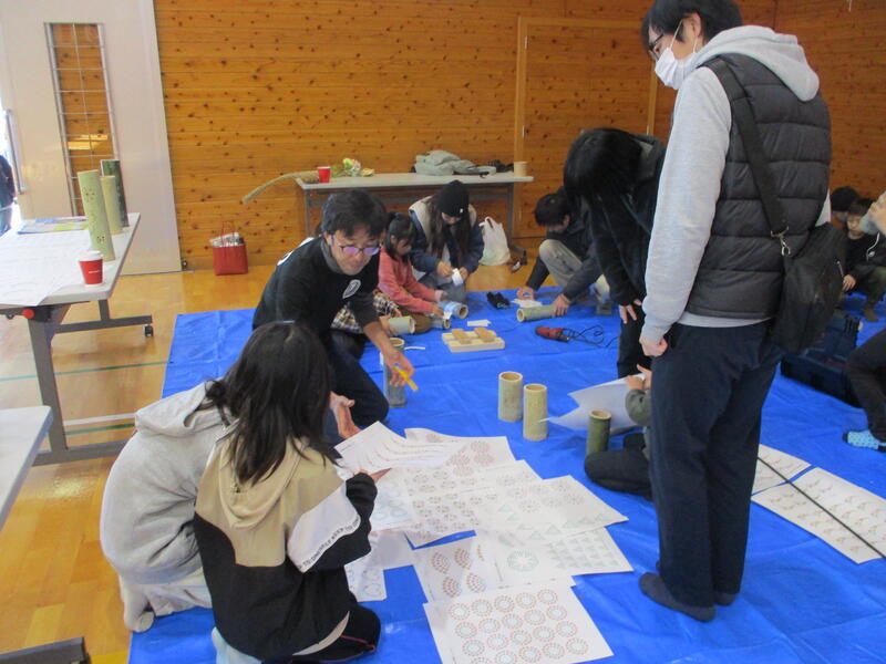 体育館前には5つのキッチンカーが並び、体育館には竹あかりなどの5つの体験ブースが並びました。