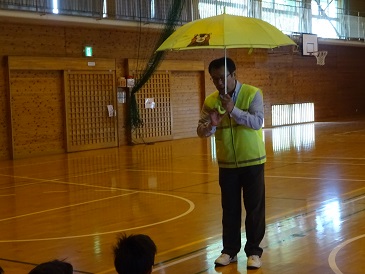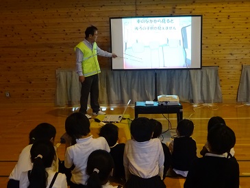 安全な道路の歩き方を交通安全協会の方にスライドを使って