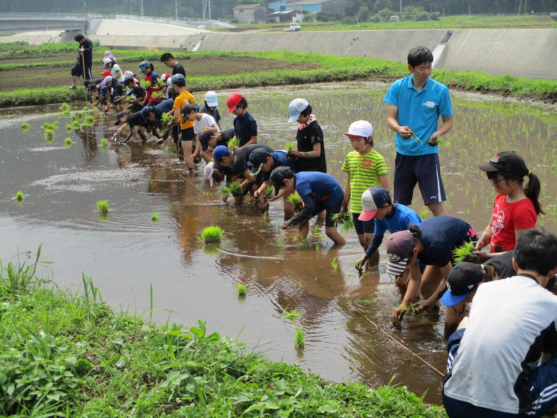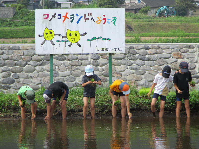 6月22日(土)9:30~11:10で田植えを行いました。学校の横の田んぼを学校田としてお借りしています。水入れから代掻き、水の調整、苗の管理などを東校区協議会(学校応援団)の皆様にお世話になり、全校児童で田植えを行うことができました。大変ありがとうございました。当日も早朝から応援にきていただき、ご指導いただきました。また、この日は、田植えだごも準備していただき、全校児童、教職員、参加された保護者や応援団の方々にお持ち帰りいただきました。心温まるご配慮に感謝します。