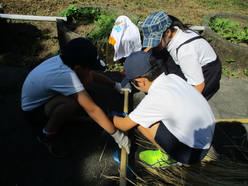 10月9日(水)の6校時、5年生の総合的な学習の時間に、かかし作りを行いました。本校の学校田コメコメランドに立てるものを製作。みんなで協力して作ることができました。