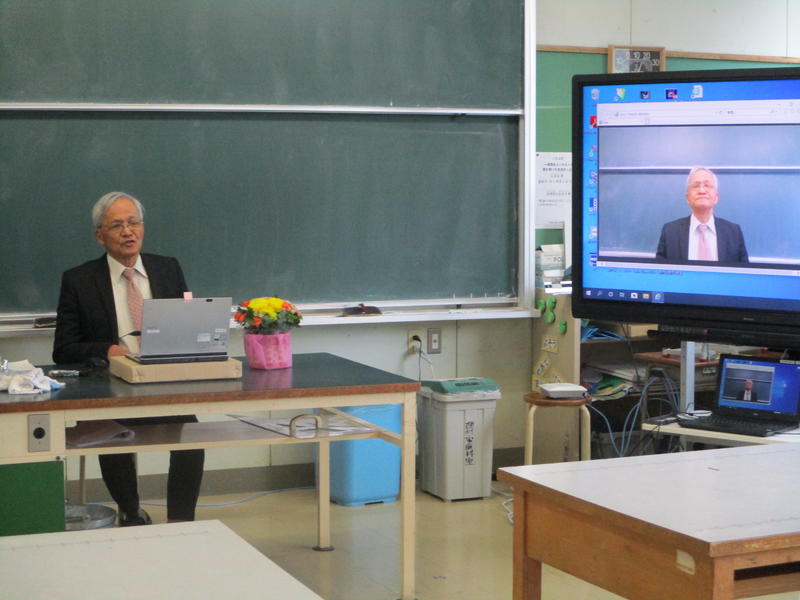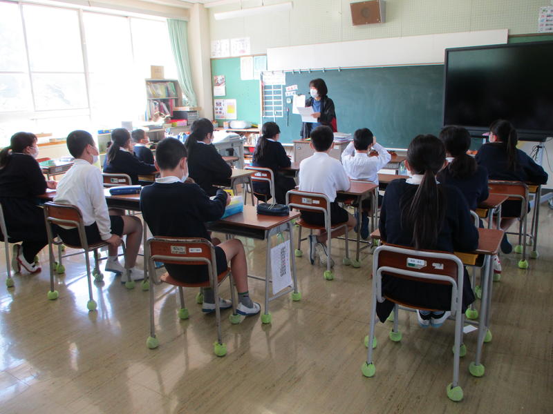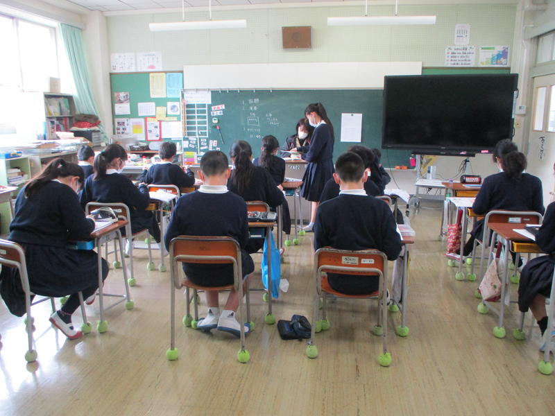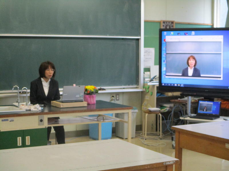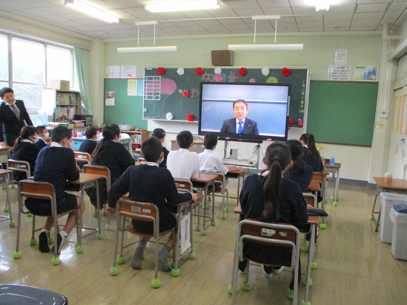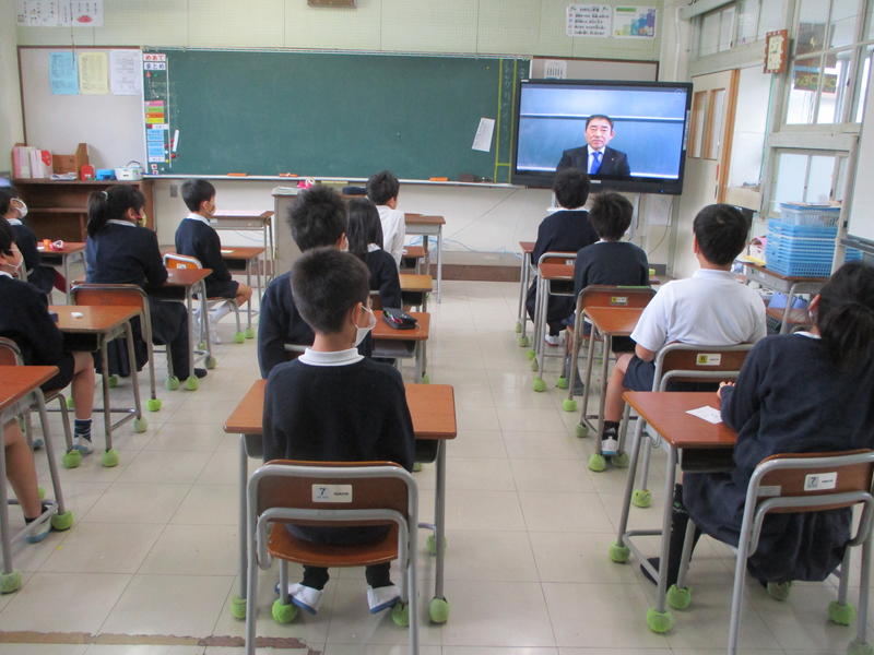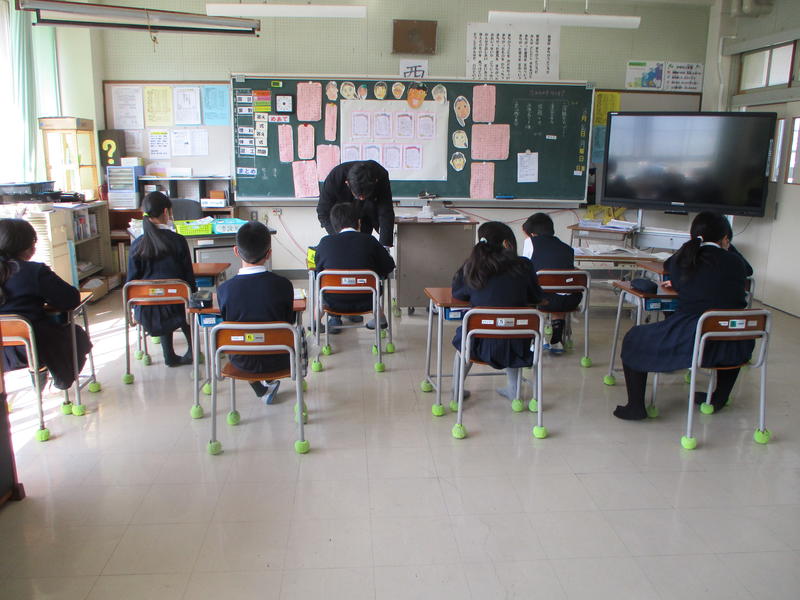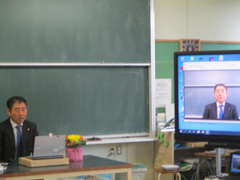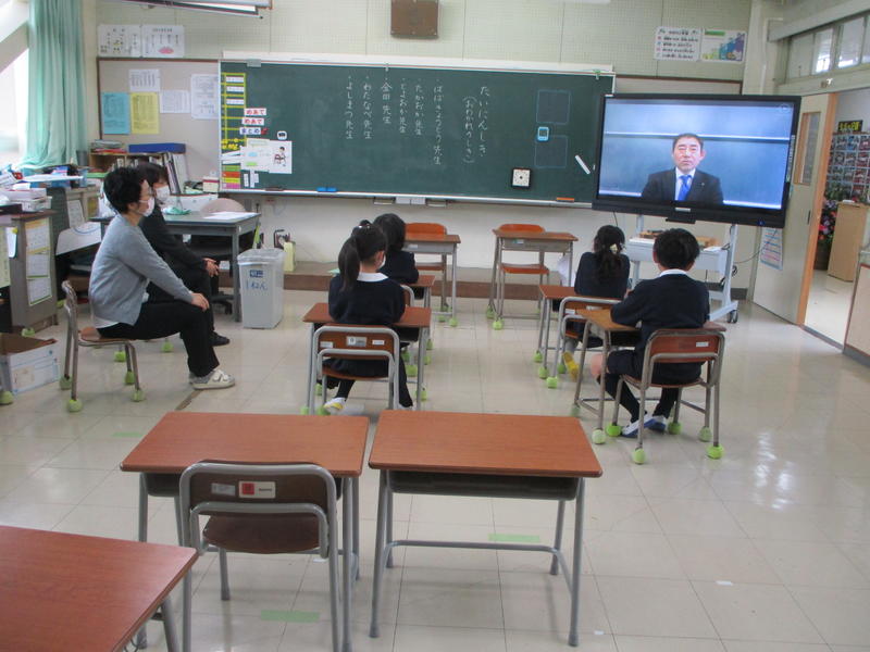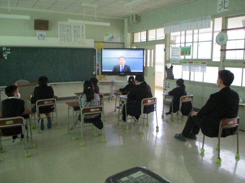 3月27日 9:00から、新型コロナウイルスの感染拡大防止のために、各教室の電子黒板への中継による退任式を行いました。