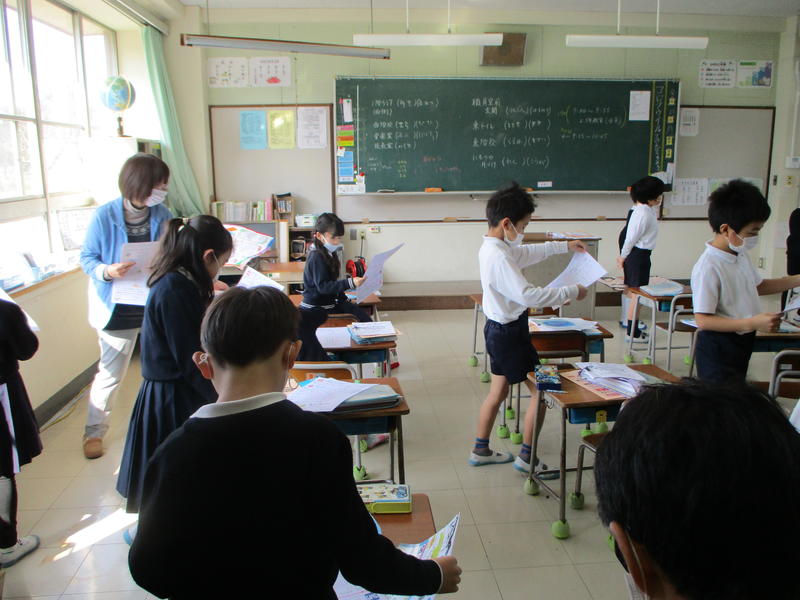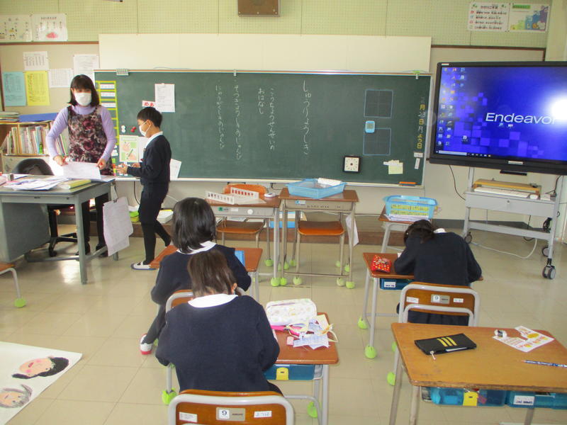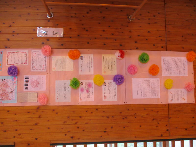 子どもたちは、元気でした。春の花々も子どもたちを迎えていました。教室では、通知表をもらい、春休みのくらしについて確認がありました。また、明日の卒業式の準備や卒業生による練習も行いました。