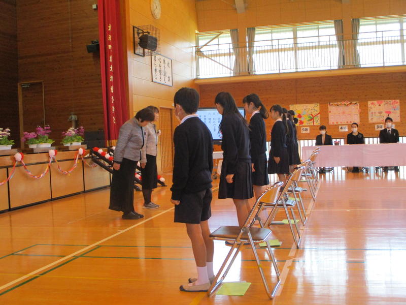 大津町から卒業証書入れ、母親部から中学校の上靴、内村地域コーディネーターからタオルの記念品をいただきました。ありがとうございました。