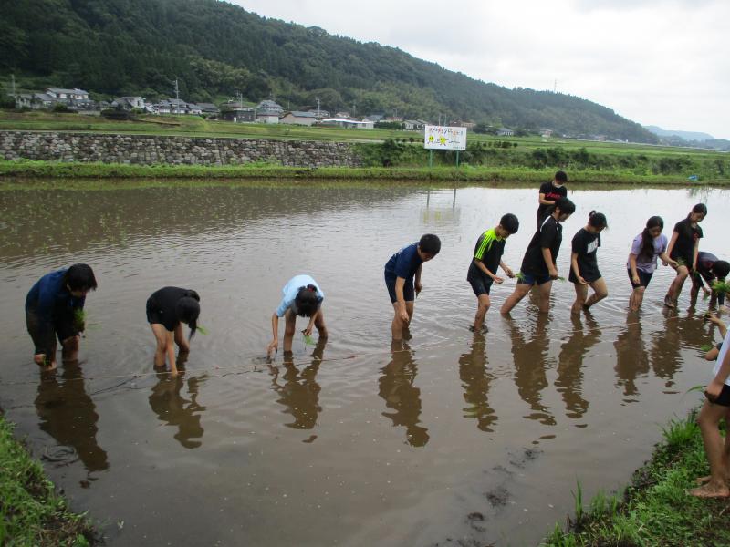 まず、事前に学校応援団の吉岡堅様のご指導で、もち米の種まき、苗床作りを行いました。その後、吉岡様に苗を大切に育てていただき、お世話をしていただきました。大変ありがとうございました。