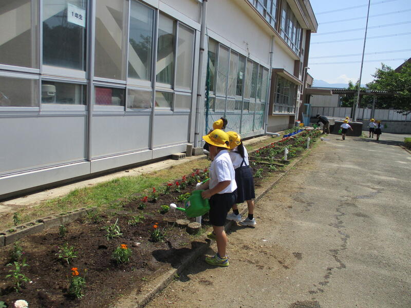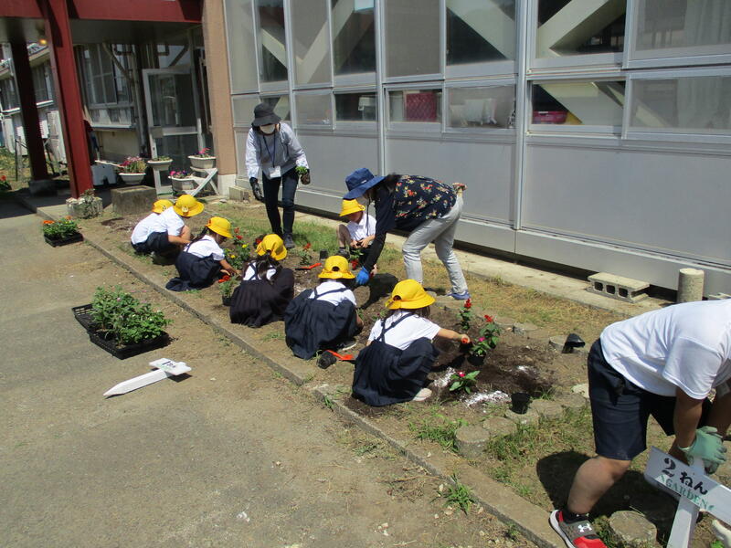 本日(5/25)の業間に、全校児童で花植えをしました。