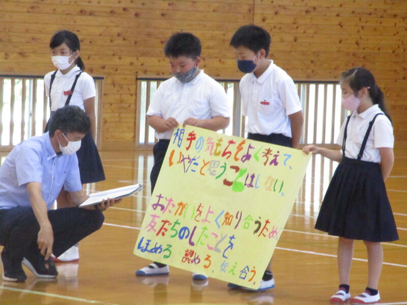 3・4年生は、「相手の気持ちをよく考えて、嫌だと思うことはしないこと」、「お互いのことをよく知り合うために、友だちのしたことをほめる、認める、伝え合うこと」について発表しました。