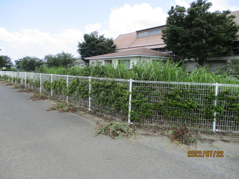 7月に入り、体育館周辺の道路では、学校側から大きくフェンスをはみ出した草がみられました。学校としても気にはなっていました。