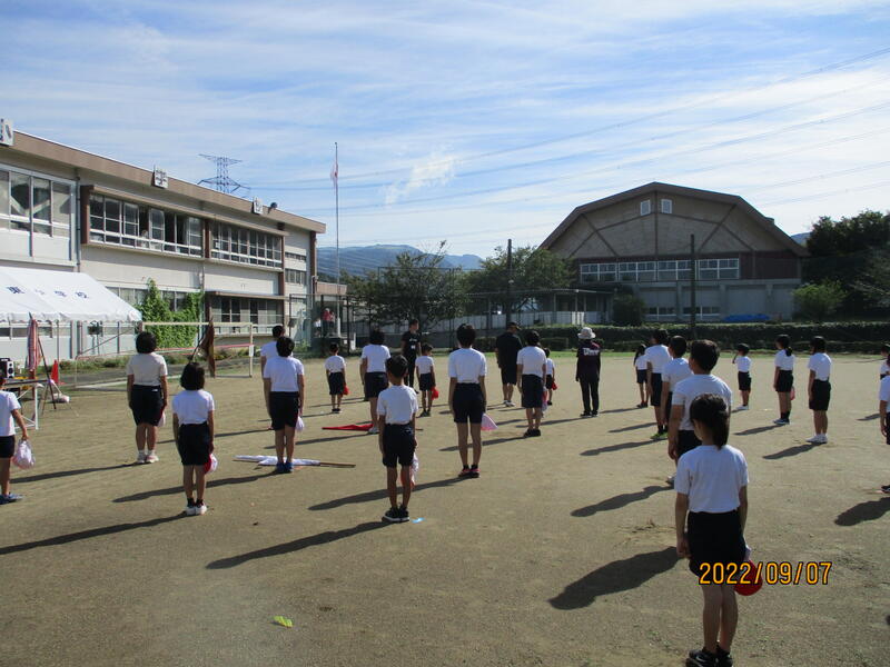 本日(9/5)2校時、全校児童は、大村詠一先生(大津町教育委員)に“からいもくん体操”をご指導いただきました。