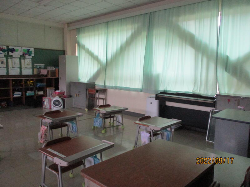 カーテンを閉め、道具を整理した1年教室