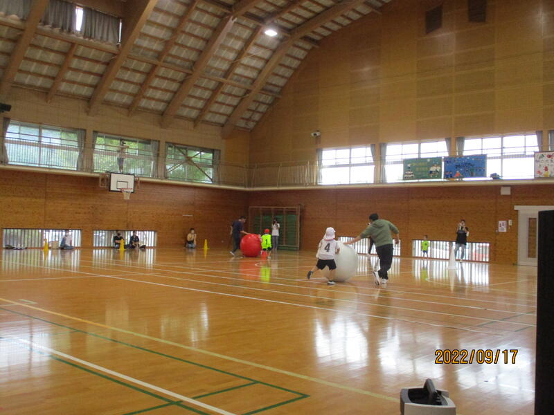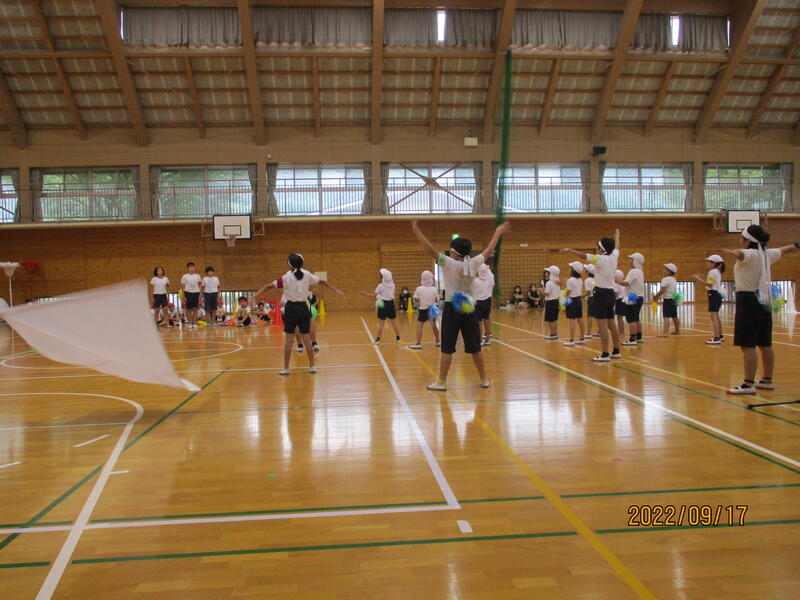 運動会を成功させたいという気持ちは、児童、教師、そして保護者も一緒です。皆の想いが一つになり、体育館では応援団演舞、全員リレーなどの競技をつつがなく実施しました。予定していた“綱引き”は、“全員玉入れ”に変更するなど、誰もが臨機応変に対応しました。