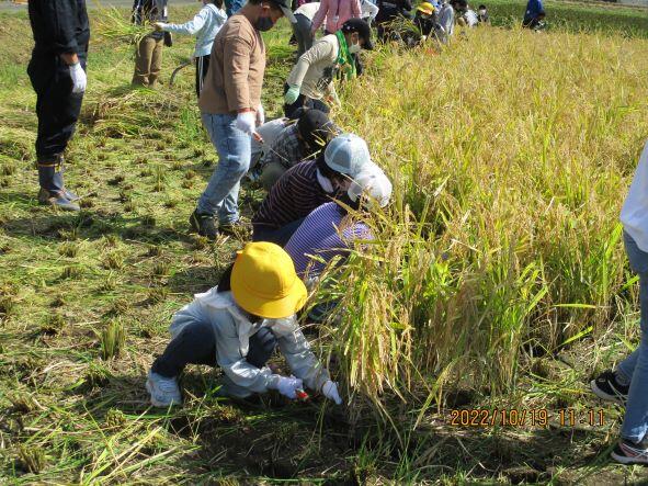 次に、コンバインで周りを刈った田んぼで、子どもたちは鎌を使い、稲刈りをしました。はじめて稲刈りをした子どもたちも、すぐに鎌扱いに慣れ、順調に進みました。そして、1時間程度で、刈り終えました。