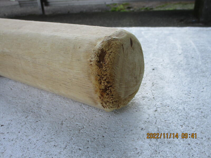 木製の杵で、石臼の餅を叩くため、杵の端が割れたり、ささくれだったりします。できるだけそうならないように、杵をサンダーで磨いてもらいました。