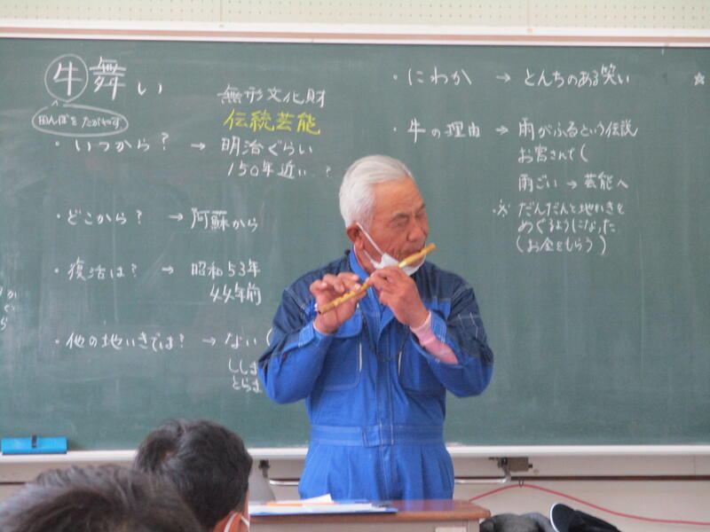 本日(11/17)、3・4年生は、総合的な学習の時間に、大津町の伝統芸能「牛舞い」について学習しました。