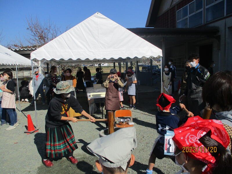 餅つきは、杵と臼を使って、子どもと保護者で力を合わせて行いました。餅は、お店で買ったり、機械で作ったりすることもできますが、今回のようにみんなで収穫した餅米を、みんなで杵でつきあげると、この上ない味に変わります。子どもたちは、何度もお代わりをしながら、餅を食べていました。