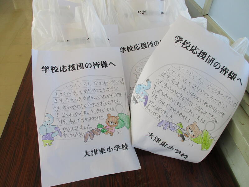 今回は、学校応援団の方や区長さん方もお招きして、学校応援団の総会もしました。13名の方に来校いただき、学校の現状を説明しました。また、安全指導の助言等もいただき、とても参考になりました。そして、子どもたちの感謝の言葉を添えて、子どもたちが作った“からいも”をプレゼントしました。皆さんに、喜んで頂くことができました。