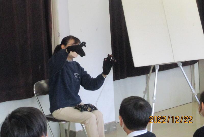 子どもたちは、カラスの親子のほのぼのした“手袋劇”やリズムのよい餅つき歌など、軽妙な技と間に感心しながら、身を乗り出して心から楽しんでいました。