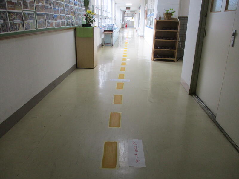 現在、1階廊下の中央線を、校務の先生に引いていただいています。