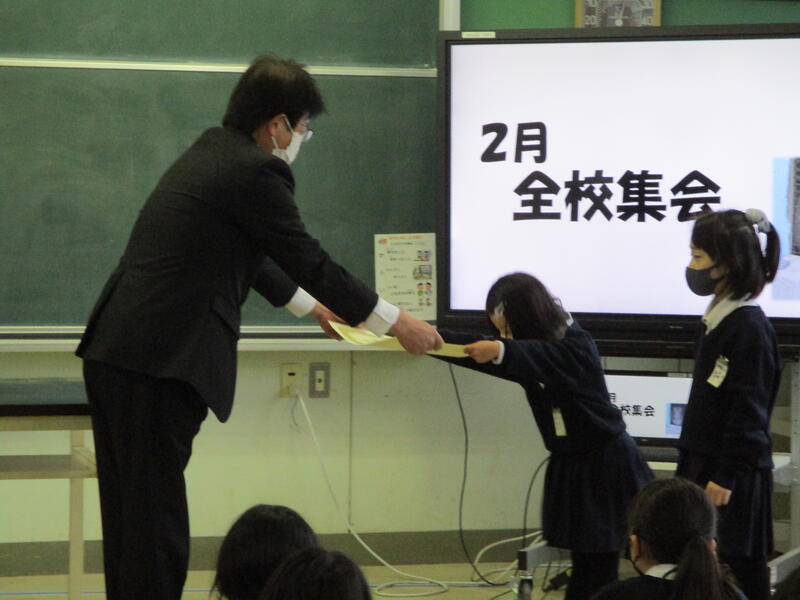 本日(2/3)の全校集会で、夢作文の表彰をしました。そして、夢大賞の上村さん(小2)、入選の江藤さん(小1)に賞状を渡しました。二人とも、作文同様に、立派な態度で受け取りました。授与の様子を見た他の子どもたちも、大きな拍手で称えました。
