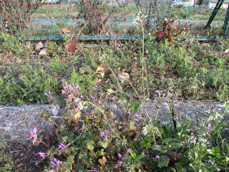 2/21の登校の際、本校の子どもが、道ばたで草花を観察していました。
