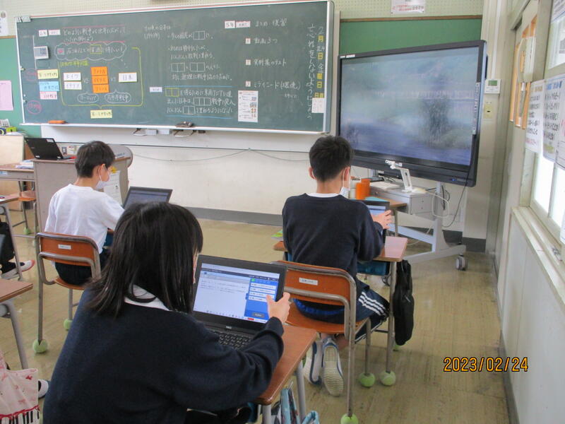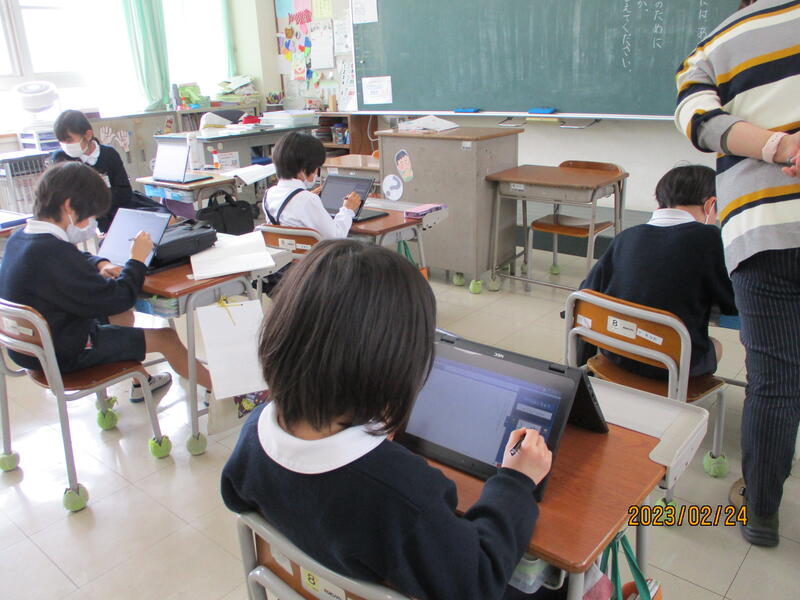 本日(2/24)、小1と小2はタブレットで漢字の学習等を行っていました。タッチペンを使い、頑張っていました。