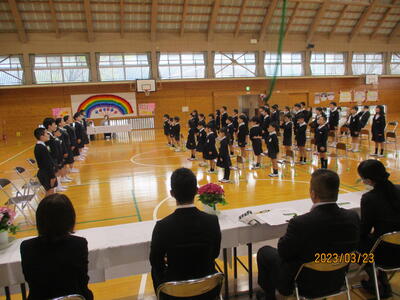 今年は9名の卒業生です。これまで学校を献身的に引っ張ってきた6年生の卒業式。在校生は、そんな6年生に感謝の気持ちを伝えようと、呼びかけや歌などを精一杯がんばりました。1時間にも及ぶ卒業式でしたが、1年生もみんな立派でした。涙を流す子どもたちや保護者の方、そして先生方の姿があり、最高に素晴らしい門出となりました。