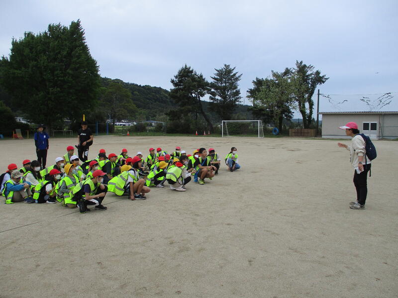 次は、遠足になります。目指すは、大津東小校区の防災避難場所である元菊阿中学校です。縦割り班ごとに1列になって移動しました。草花や鳥の観察、クイズやしりとりなどをしながら、とても楽しく移動しました。避難場所では、「災害の際にこの場所に避難すること」を確認しました。