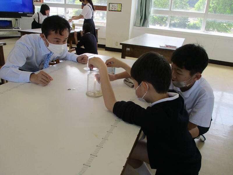 今回、5年生は種の発芽について、電子黒板を使って学びました。6年生は、ものの燃え方について火を使った実験をしました。