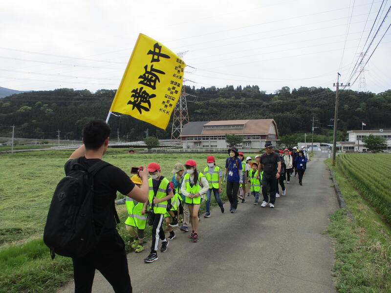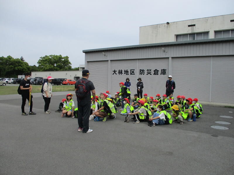 次は、遠足になります。目指すは、大津東小校区の防災避難場所である元菊阿中学校です。縦割り班ごとに1列になって移動しました。草花や鳥の観察、クイズやしりとりなどをしながら、とても楽しく移動しました。避難場所では、「災害の際にこの場所に避難すること」を確認しました。