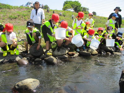 本日(4/27)、白川にウナギとアユの稚魚(ちぎょ)の放流をしました。今回は、理科で河川の流れや生き物について学ぶ小3・小4が対象です。