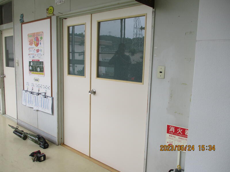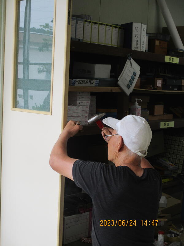 本校の校舎は、50年を超す歴史があります。当然建具も古くなっているため、常に少しずつ改修をしています。そして今回は、放送室と資料室のドアを交換していただきました。カンナとノミを使い、最終調整をされる建具屋さんの技術に感心しました。